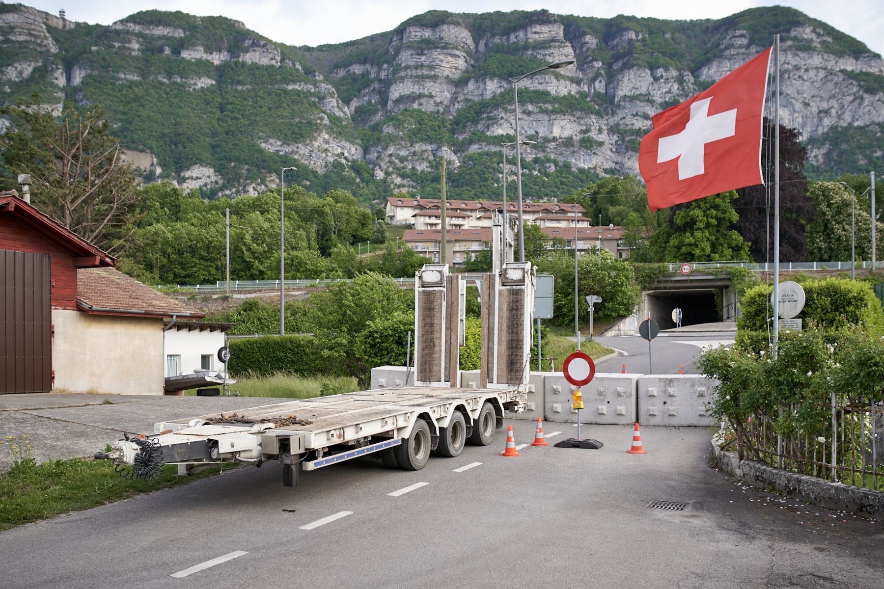 “Im März 2020 wurden die Landesgrenzen der Schweiz geschlossen und das ur-helvetische Grundgefühl der Unverletzbarkeit durch die Corona-Pandemie tiefgreifend erschüttert. Buchstäblich über Nacht wurden für selbstverständlich gehaltene Freiheiten beschränkt, der tagtägliche Austausch mit den Nachbarländern abrupt unterbunden. Das verständliche Bedürfnis nach Schutz vor einem lebensbedrohlichen Virus traf auf bürokratische Regelwerke. Jan Sulzer hat die plötzlich aufgetauchten Grenz-Barrieren der Schweiz fotografisch dokumentiert.”